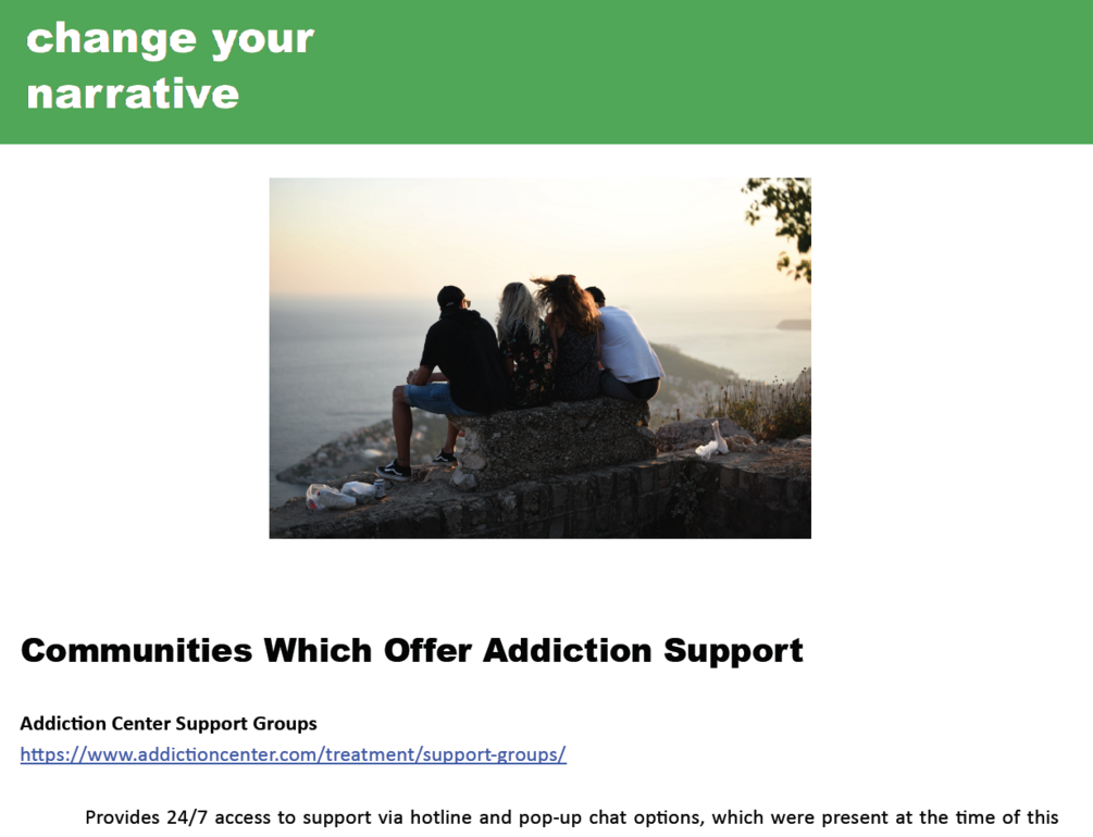 Downloadable PDF with resources for addiction, including a listing of communities and insight on where to turn for guidance.